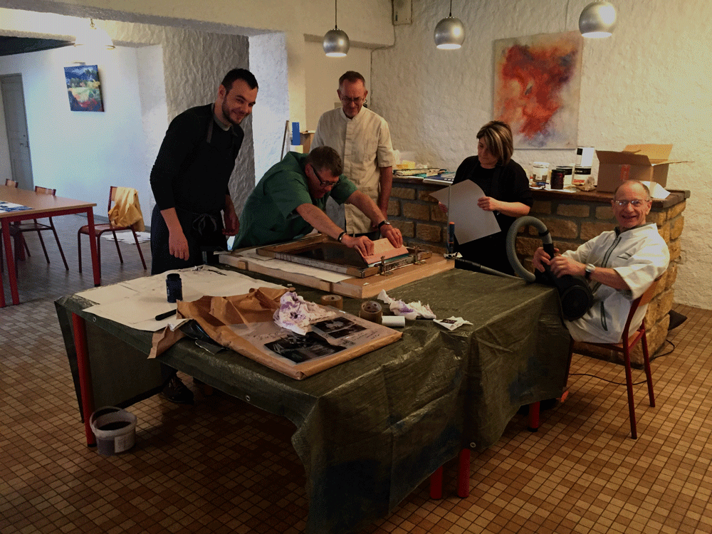 Un mois plus tard, nous retournons sur place en compagnie de Nicolas Pasquereau, le graphiste en charge de ce second opus. La maquette graphique est quasiment terminée, il ne reste plus qu’à inclure les derniers détails, veiller à ce que rien ne manque. Le mercredi après-midi, c’est Nicolas qui guide avec brio un atelier de sérigraphie : les habitants réalisent le poster central du journal qui est en train, au même moment, de sortir des imprimantes de la mairie.
