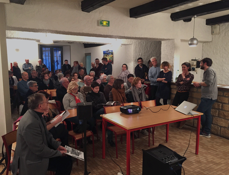 En février dernier, nous retournons visiter notre escouade briotine qui nous attend de pied ferme à la salle polyvalente de Mance, impatiente de voir le film et de trinquer entre amis ! Cette fois nous sommes sur place pour confectionner un objet papier : le deuxième numéro de notre collection de Fanzine, fraichement baptisé « Journal Bitume – des regards dans l’action ». Ce cahier donne la parole à des actions concrètes et situées.