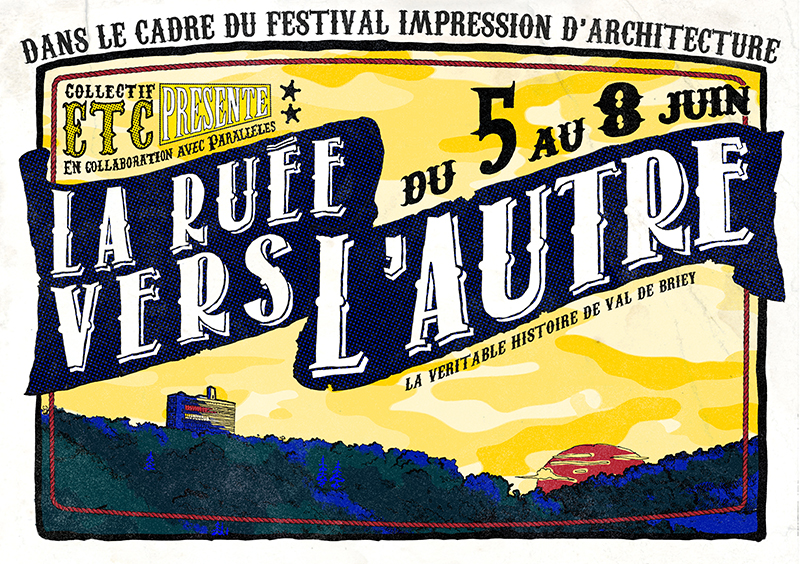 Après une première visite, cet espace naturel en fond de vallon mêlé à un passé post-industriel nous évoque un imaginaire de pionnier, de conquête et de rencontre. Le contexte géopolitique n’y est pas pour rien : le rassemblement des trois communes de Val-de-briey a des airs de western, d’un univers pionnier à la rencontre de l’autre. Lors des premiers ateliers avec les habitants, nous partageons cet imaginaire, quelque peu décalé, un semblant naïf. A la suite de cela, nous préparons une campagne de tractage qui annonce la couleur : un remake de conquête du Far-West mêlé d’or et d’argent.