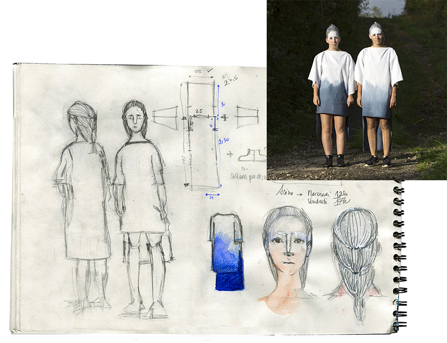 Nous finissons les constructions à la lueur des frontales. Les dernières images sont tournées, les habitants acteurs du film revêtent leurs costumes qui incarnent les esprits des lieux. Les constructions se parent de la même teinture bleue, d’étranges signes apparaissent pour éveiller la curiosité du joggeur. Personne ne sait exactement ce qu’il se passe, mais chacun s’affaire de son côté. Bientôt les constructions seront finies et le tournage du film aussi.
