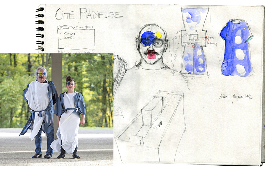 Le travail de Pola architecte/illustratrice fait le pont entre fiction, réalité et grand paysage : entre le monde du film, et celui des constructeurs. Elle dessine notre quotidien : les temps de réunions, des repas, des bribes de chantier. Ses dessins s’immiscent dans les constructions, et deviennent les effets spéciaux du film.
