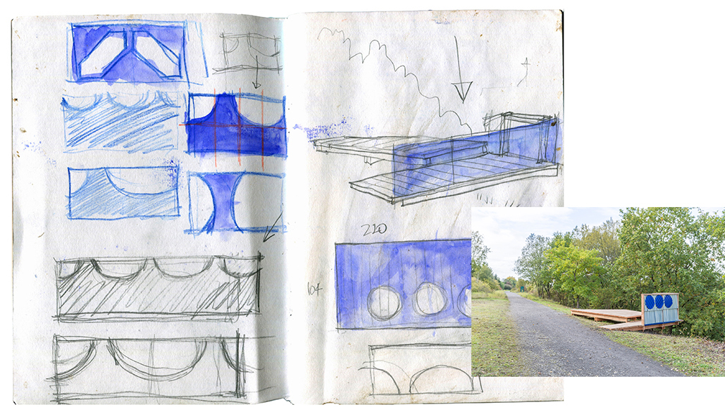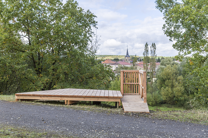 L’emplacement des installations a été choisi en amont lors d’une balade avec les habitants, animée par Romain Zattarin, chargé de projets culturels à la mairie de Val-de-Briey, au cours de laquelle bocage et figures tutélaires étaient invoqués. Notre projet s’inscrit dans une démarche à plus long terme des « grandes lignes du paysage » qui, à l’instar du Woigot, tissent des liens entre les trois communes.
