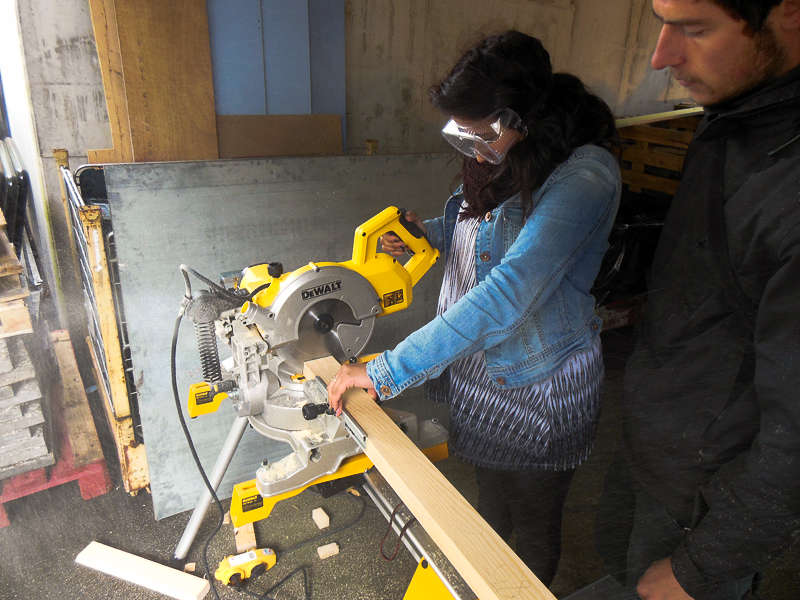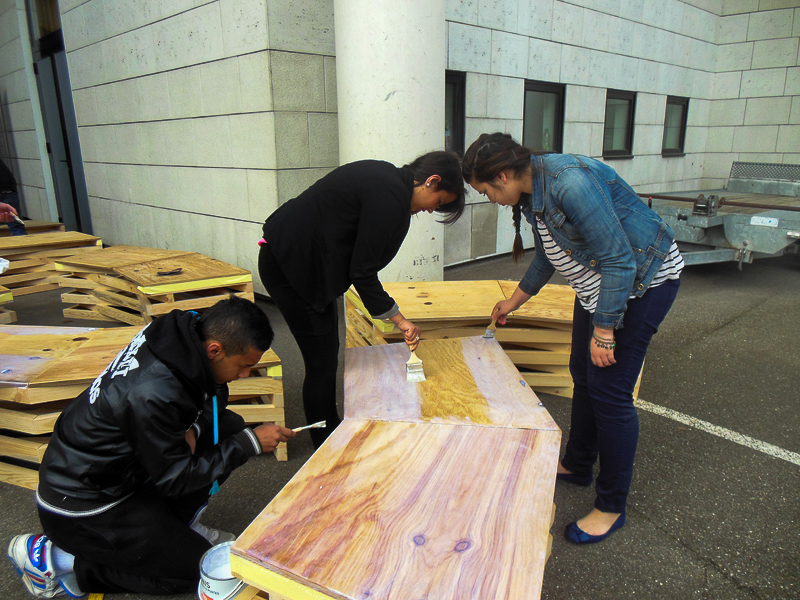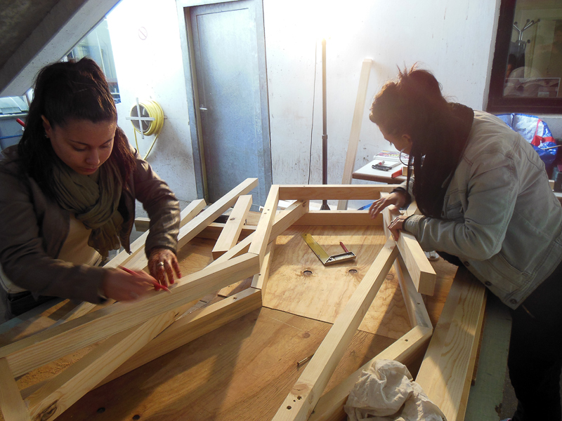 Quatre jours d’ateliers ont été nécessaires pour fabriquer huit modules d’assises, construits à partir de tasseaux en pin et de panneaux de bois contreplaqués. Les tasseaux ont des sections de 60*35mm. La superposition de sept niveaux de tasseaux, avec la plaque de contreplaqué de 3cm donne une hauteur d’assise finale de 45cm.