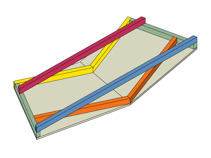 Une fois l’ensemble des tasseaux de bois découpés, l’étape suivante consiste à les assembler suivant le schéma ci-dessous. Les couleurs correspondent aux différentes longueurs coupées dans l’étape précédente. Les morceaux jaunes et oranges sont collés aux plaques de contreplaqué, puis vissées dans notre cas avec des vis de 70mm de longueur. A chaque intersection de tasseaux, une vis est présente ainsi que de la colle à bois. Les superpositions suivantes de tasseaux sont maintenues avec des vis de 80mm.