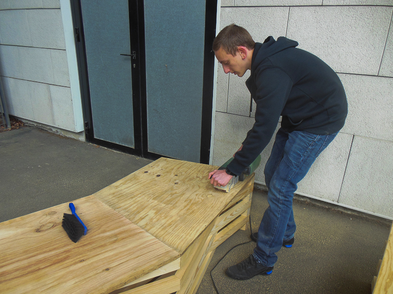 Lorsque les sept niveaux de tasseaux sont vissés, quelques finitions sont apportées. Les éventuels tasseaux qui dépassent sont poncés, ainsi que les plateaux d’assise. Un chanfrein sur les bords du plateau permet d’adoucir les tranches. Puis deux couches de vernis sont appliquées sur le contreplaqué.