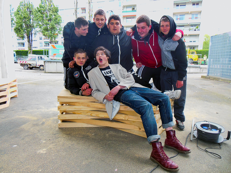 LE COLLECTIF ETC TIENT À REMERCIER : tous les lycéens et étudiants qui ont participé à l’aménagement de leur hall, Jean-Luc Raynaud et l’équipe pédagogique qui ont organisé ce chantier, le proviseur du lycée qui donne la possibilité aux lycéens de découvrir le travail du bois. Merci aux techniciens du lycée pour leur disponibilité et leurs conseils, la scierie Gunstett pour la qualité de son bois, et la section transport poids lourd du lycée, pour récupérer le paquet.