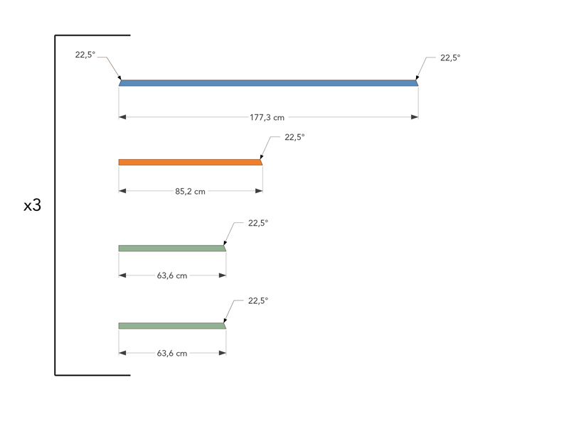 Pendant que certains s’occupent de découper les panneaux, un autre groupe prend les mesures pour découper les tasseaux de bois. Sur tous les tasseaux, un angle de 22,5° doit être découpé. Cette mesure est prédéfinie sur la majorité des scies radiales. Sinon, un bon rapporteur avec un crayon taillé fera l’affaire. Voici la liste des tasseaux à découper. Chaque groupe de tasseaux représente une tranche du meuble. Le premier groupe doit être découpé trois fois et le second, quatre fois.