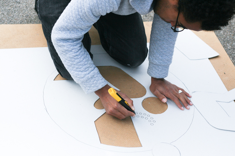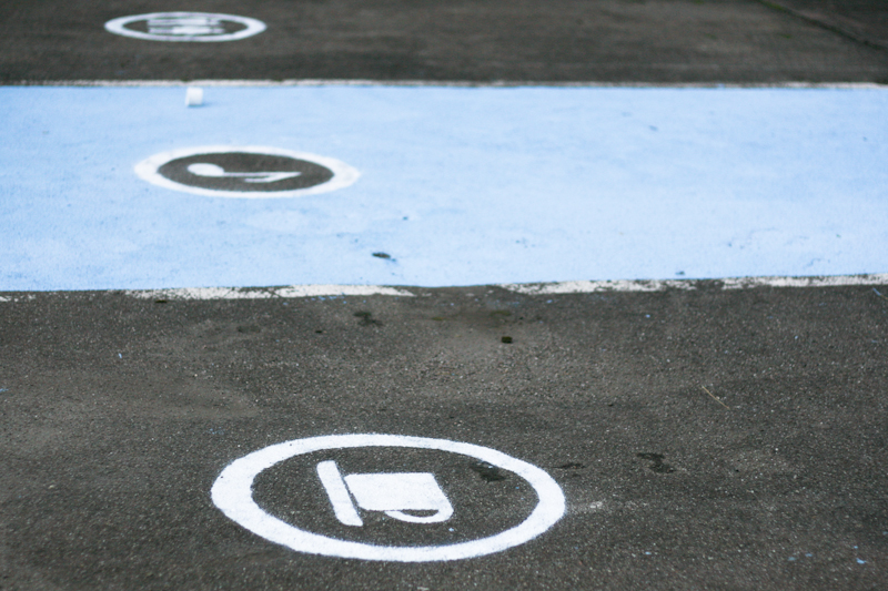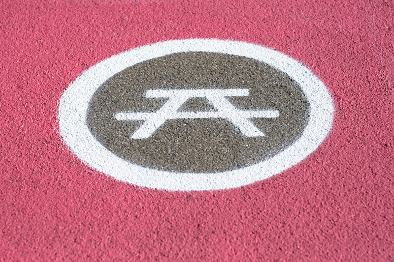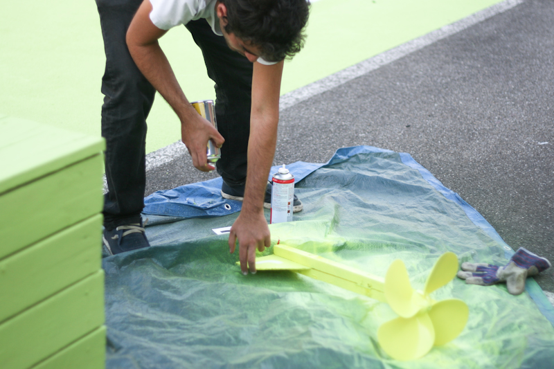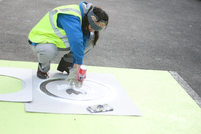 D’abord d’anciennes places de parkings, complètement peintes, avec un pictogramme de programme correspondant à un module existant aujourd’hui, lui aussi peint de la même couleur. Ceci dans le but de montrer que certains usages ont déjà été activés, comme le terrain de foot ou la table de pique-nique.