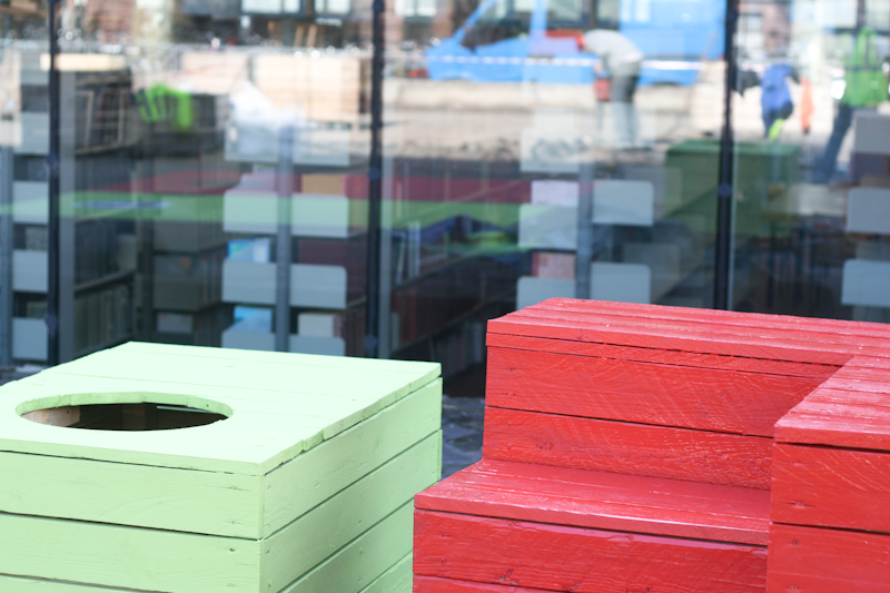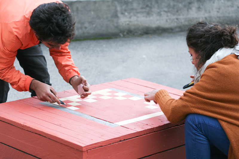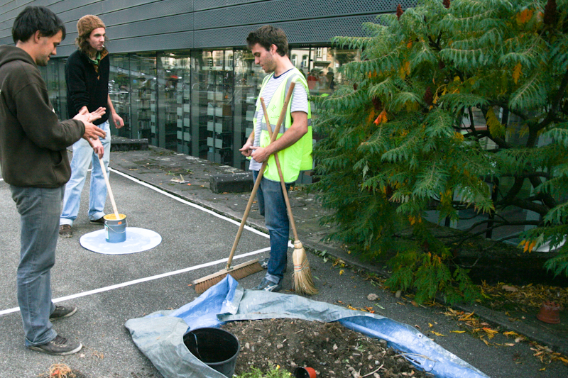 La deuxième étape, qui s’est déroulée toute la journée du 11 octobre 2011, avait pour objectif de donner un coup de jeune aux modules, mais aussi de suggérer et d’interroger les futurs usages possibles de cet espace. Utilisant la trame existante des places de parking, révélant l’origine passée de ce lieu tout en rendant spatialement abstrait les programmes proposés, l’intervention a relevé de trois aspects, correspondant à trois temporalités différentes :