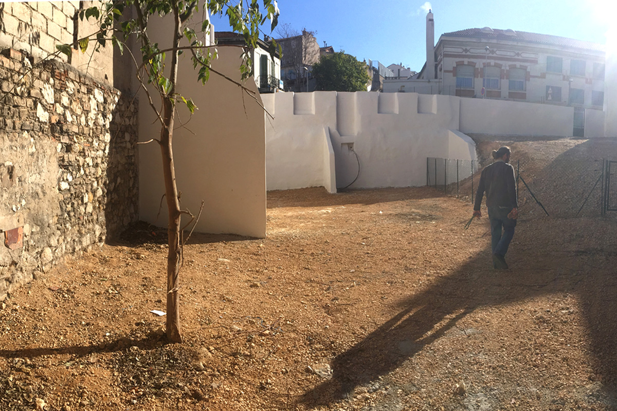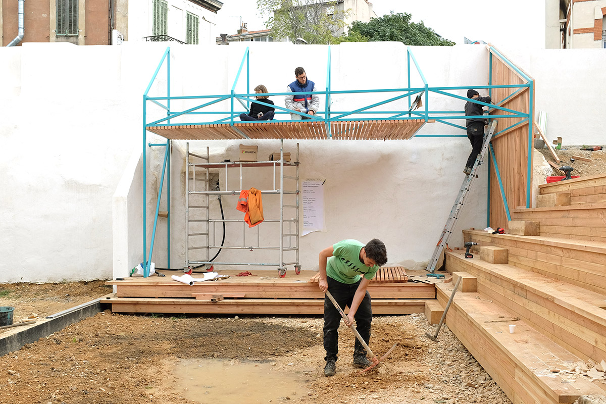Au printemps 2017, les jardiniers de la Fraternité étaient venus nous rencontrer à l’Ambassade du Turfu et nous avaient sollicités pour les aider à reconstruire un abris extérieur sur leur parcelle de jardin partagé. A cette même période, l’immeuble mitoyen des locaux de la Fraternité venait d’être démoli, laissant place à un terrain en friche de 400m². S’en faisant l’acquéreur, la ville avait alors proposé à la Fraternité de l’occuper de façon transitoire pour y étendre ses activités. Nous avons alors eu l’envie de poursuivre notre collaboration, en pensant puis en construisant un équipement temporaire sur ce terrain.