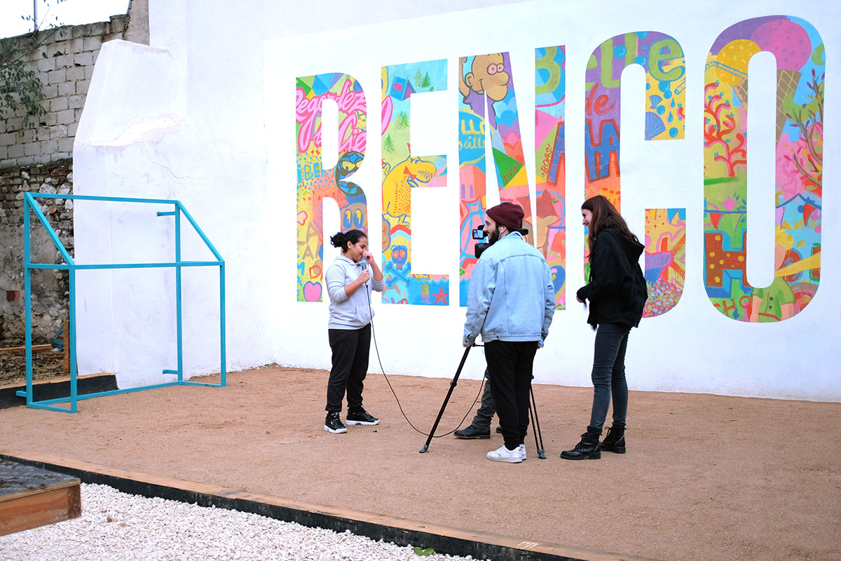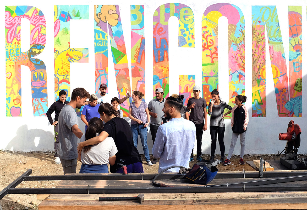 Dans leur projet, les adolescents avait aussi exprimé un désir de peindre les grands murs d’enceinte du terrain pour inscrire des messages et y apporter de la couleur. Et comme chaque année à l’Ambassade du Turfu, nous invitons des créatifs en résidence, pour mettre son savoir-faire au service de groupes du quartier, nous avons saisi cette occasion pour répondre à la demande des ados. Pour cette troisième résidence du Turfu, nous avons alors proposé au collectif espagnol Boamistura, de mettre en jeu l’un de ses outils de création ouverte sur le Rin-té.