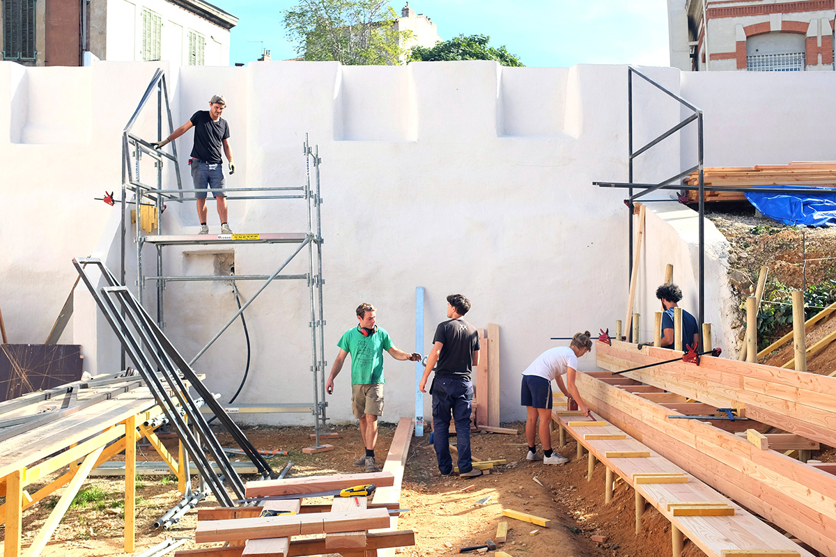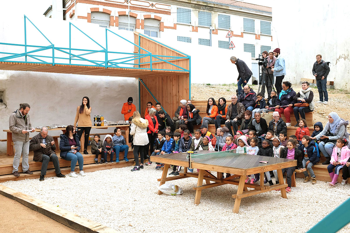 Au cours de sa troisième année d’implantation dans le quartier de la Belle de Mai, le Collectif Etc a accompagné ses voisins de la Fraternité Belle de Mai dans la construction d’un équipement ludique et convivial sur un terrain attenant à leurs locaux. Un outil d’autonomisation pensé et réalisé avec un groupe d’adolescents, à destination des usagers du centre et, plus largement, des habitants du quartier. Une première phase d’ateliers a été menée entre l’hiver 2017 et l’été 2018 pour mettre au point le projet. Puis un temps fort s’est tenu à l’automne 2018 autour d’un chantier de co-construction, avec la collaboration avec le collectif espagnol Boamistura pour une intervention artistique déployée dans le cadre d’une résidence à l’Ambassade du Turfu.