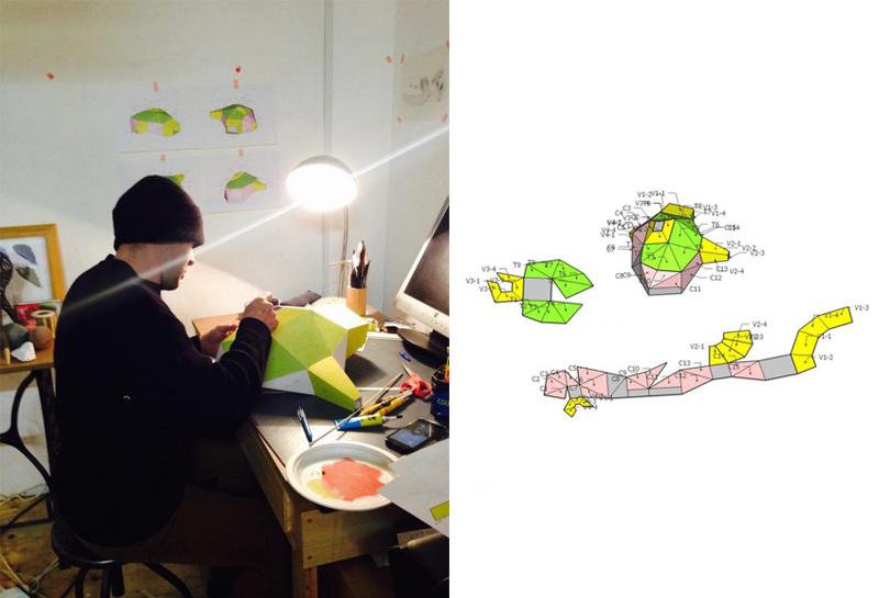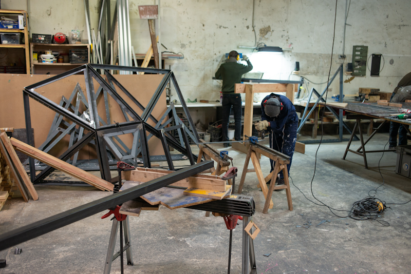 Cela ne nous arrive pas si souvent, mais le Rocher a été longuement mûri et préparé en atelier lors d’un chantier hivernal à Marseille. Si sa forme, ses cadrages et sa raison d’être sont intimement liés au contexte géographique, sa réalisation a été menée en intérieur. C’est un travail délicat composé pas à pas, assemblé pièce par pièce, sans toujours savoir bien comment tout cela allait s’ajuster. On a souvent croisé les doigts pour qu’advienne cette géométrie faite de triangles uniques et bardée sur mesure. La bête est ainsi composée de plusieurs morceaux : les facettes de ce vaisseau, équivalentes à plusieurs grandes chips de métal, ont été dessinées pour rentrer dans un camion de 20 mètres cube, pour être ensuite acheminée sur le plateau de l’Arbois.