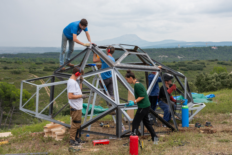 Une fois sur place, nous avons monté le Rocher sur cale. Comme une épave de camion à qui on aurait piqué les pneus, les cornières de métal pointant déjà dans les directions cadrées, on aurait dit un astronef rétro futuriste écrasé au milieu des herbes de la garrigue. Il nous a fallu un peu de temps pour ajuster le Rocher et le mettre sur pied. Avec un extincteur pas loin et les protections adéquates, nous avons soudé cette carcasse pour lui redonner sa forme complète.