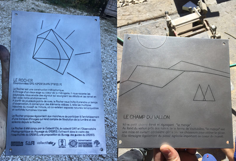 From the beginning, invisible stories guided The Roc’s conception. From rare specie like bonelli’s eagle to complex irrigation system connected with the Canal de Marseille nearby, landscape is made of a stories’ network that time has sediment. We wanted to dig some of them out and explain some outstanding features in informative plaques. As usual, we wanted to find a specific and appropriate way to design them and incorporate it in our metaphorical frame. We soon found Pioneer plaque as a very motivating inspiration to do so, and call a friend to help us create some abstract design that could fit with both our information texts and that Pioneer inspiration. Once again with this project, it wasn’t easy to make it happen. Very expensive usually, aluminium engraving was made possible with the use of our CNC milling machine. We hope these will make possible for 2450 people to understand something of this landscape UFO.