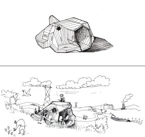 « The Roc » is a landscape observatory, a metaphorical object that will lead you to the unknown surroundings and underline its invisible parts. That complex form, this stone made of burned wood and aluminium liked paint, will let you observe and understand some parts of this human-made natural environment.