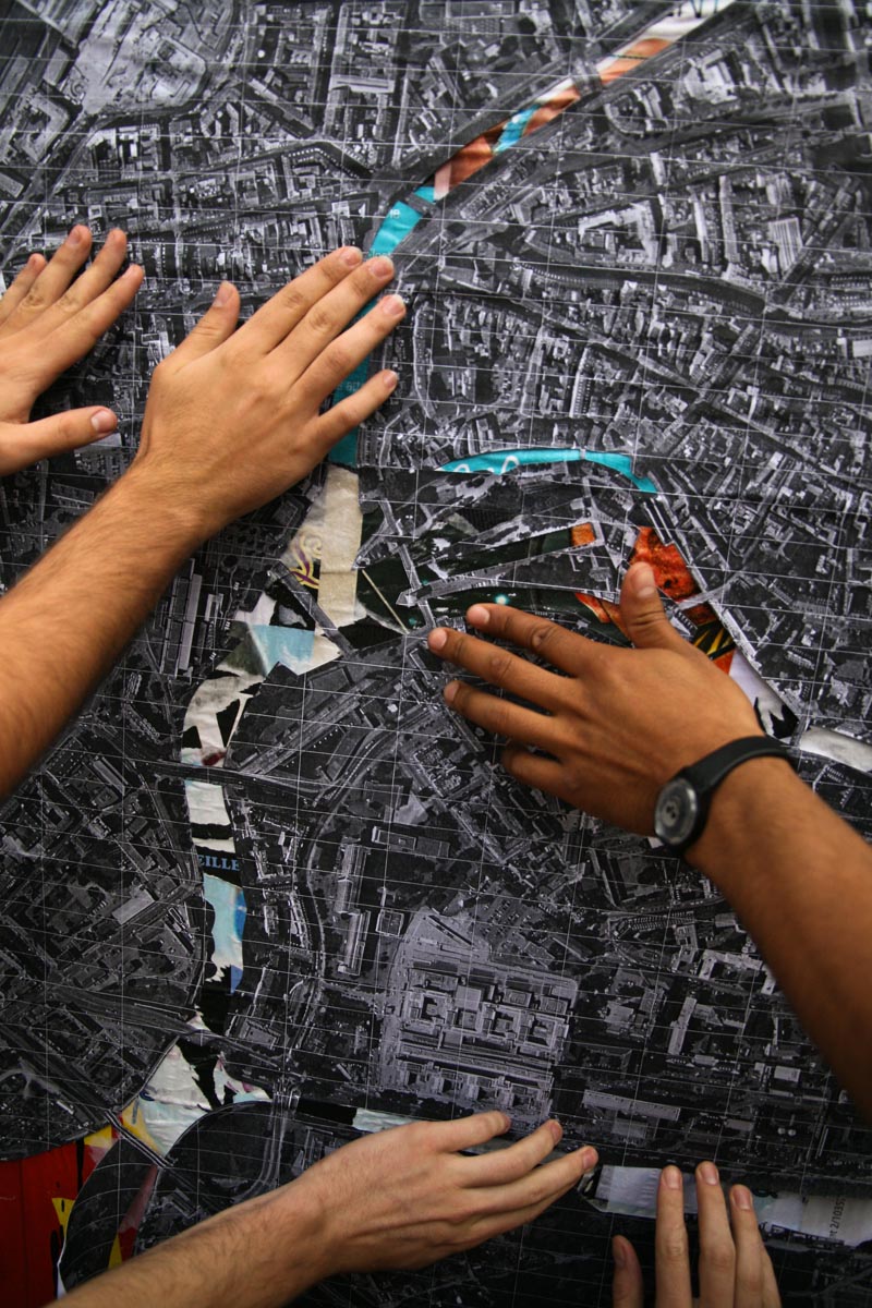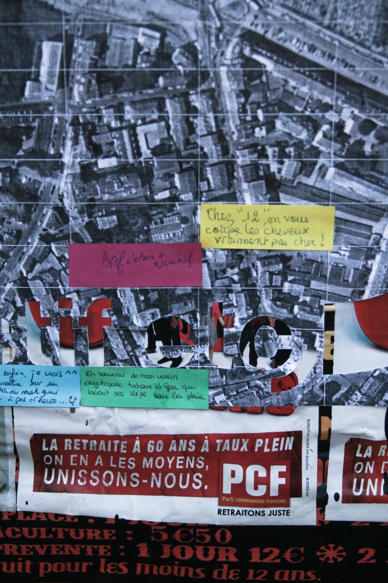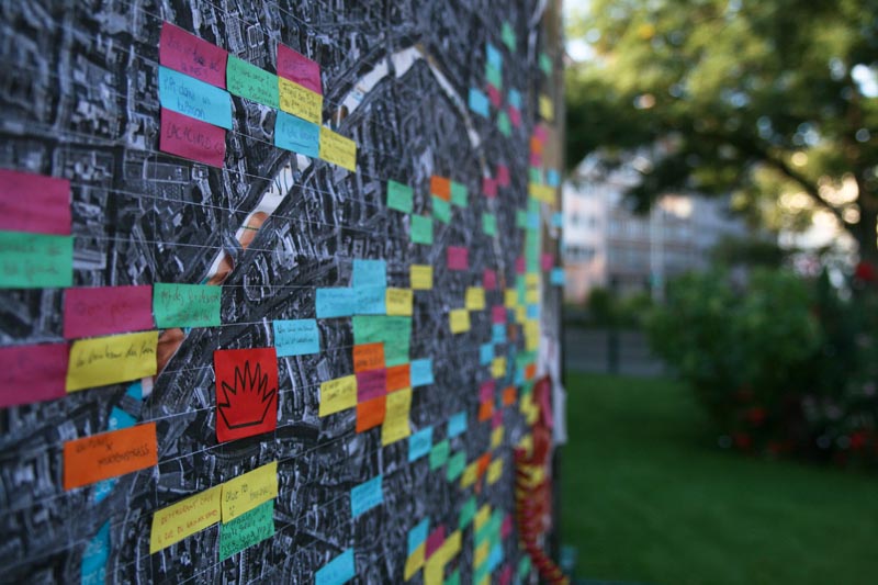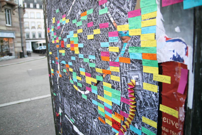 Une simple photo aérienne de Strasbourg. Nous invitons les passants à s’approcher, à se repérer, et à se rappeler une expérience qu’ils ont eu à Strasbourg. Ils l’écrivent sur une languette de couleur et la collent. En vert pour une anecdote anecdote, en bleu pour une rencontre, en orange pour l’art urbain, en rose pour un amour sauvage, et en jaune pour le bon plan.