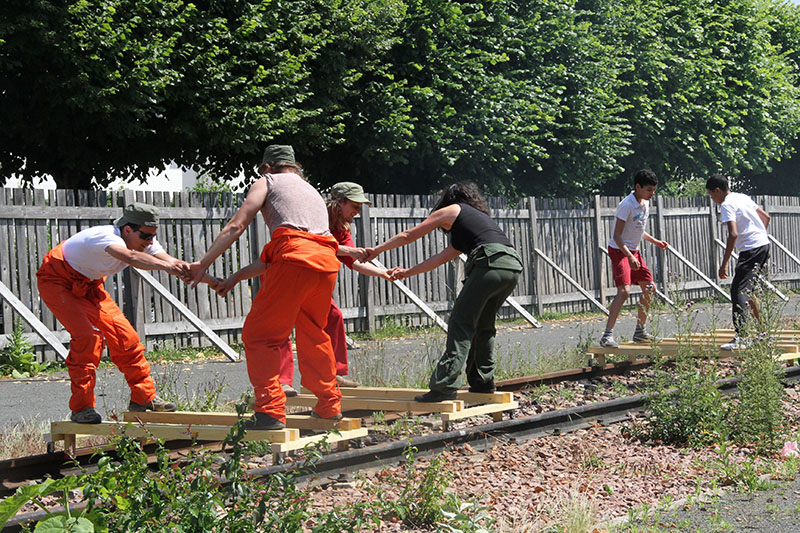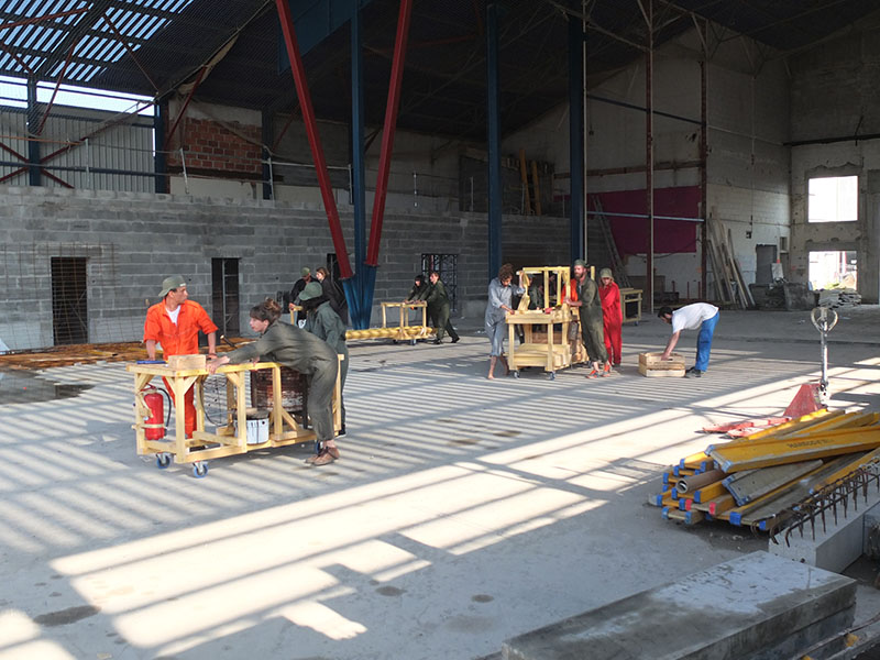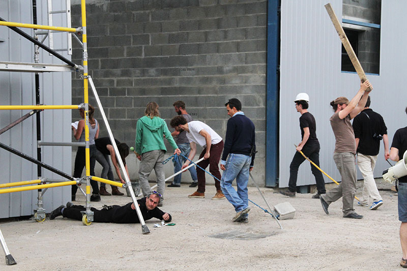 Au bout de quelques journées, un besoin d’action se fait sentir. Sur la proposition des apprentis, on sort de la salle de réunion pour aller faire des improvisations dans le chantier. Ils ont tous l’air de savoir de quoi ils parlent, entre membres du Collectif Etc on est un peu plus inquiets. Certains proposent quelques sujets pour les improvisations « vous ramassez tous un objet et vous le traînez par terre en marchant doucement », on s’exécute tous. On découvre le groupe sous un autre angle.