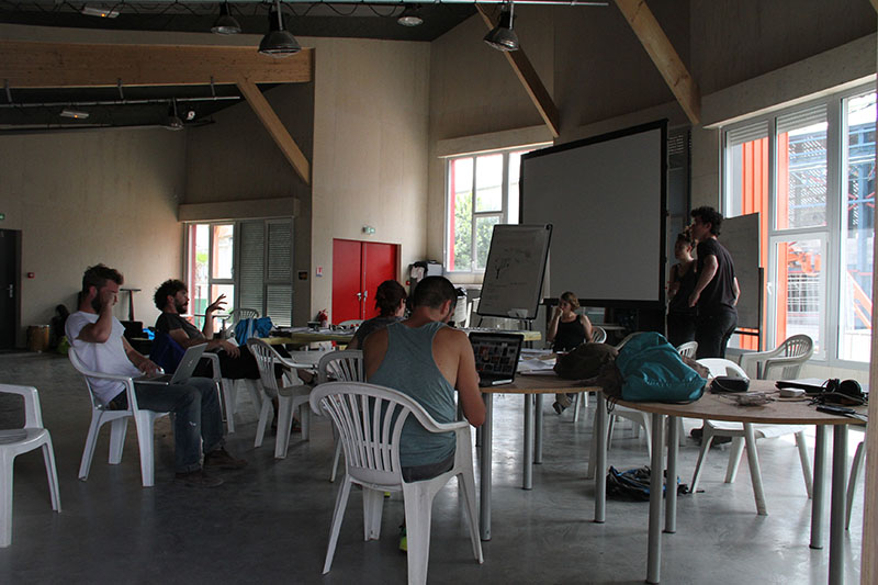 Écrire un projet qui soit à la croisée de nos disciplines nécessite selon nous une écriture collective. Malgré notre position « d’encadrants pédagogiques », nous ne voulions pas encadrer des exercices pré-établis, mais nous souhaitions participer à un projet avec l’ensemble de la promotion, comme si nous ne formions qu’une seule et même équipe. Nous proposions simplement d’apporter notre méthodologie de travail de groupe et d’auto-gestion.