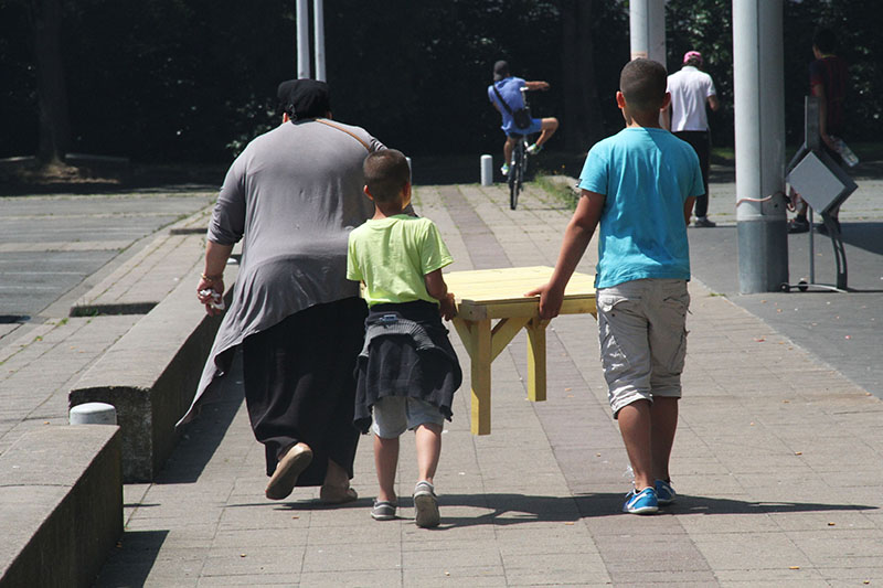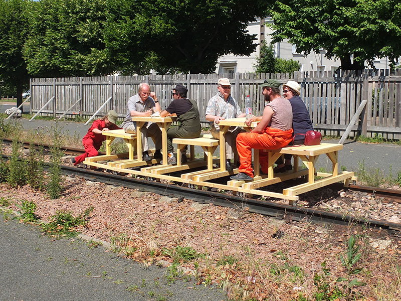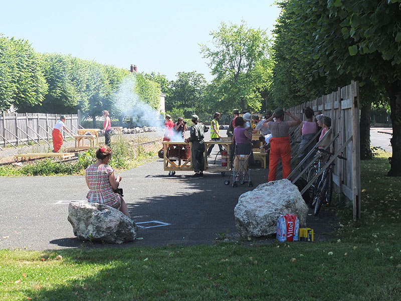 Lors des premières visites, nous étions tombés sur le hangar où une bande de passionnés restaurent un des derniers spécimens de locomotive Pacific 231 E 41. Ce symbole de la ville a été installé pendant près de 40 ans sur une place du quartier ouvrier, classé monument historique depuis 10 ans, elle vient d’être enlevée pour sa restauration. Les deux rails qui attendent son retour se font doucement recouvrir par une végétation spontanée, les locaux disent que ça a laissé un sacré vide. Nous en proposons un détournement en attendant le retour de l’imposante machine. Les tables viennent se disposer sur des châssis à roulette, on installe en quelques minutes un espace public sur rail. On s’installe pour une translation, les positions varient et offrent diverses configurations. Pierre bouillonne, il fouille dans ses mauvais souvenirs, il nous raconte d’autres bribes de sa vie et finit par envoyer valser les constructions. La fête est finie, on reprend la route !