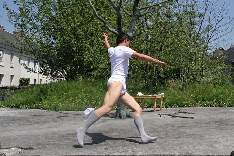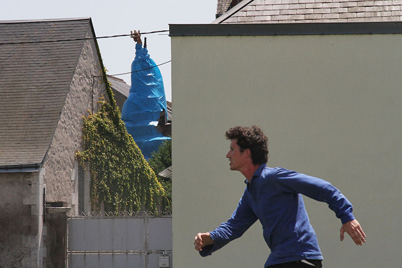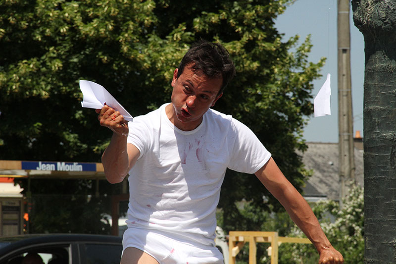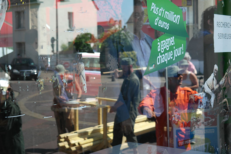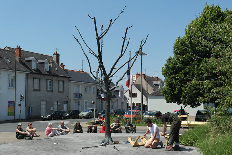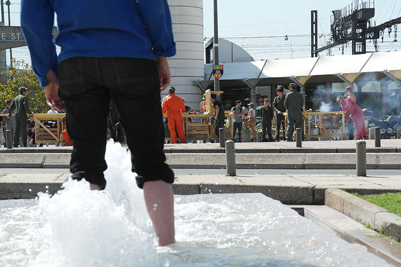 Place de la gare, la machine se met en marche, les premières tables sont produites. La ville s’est profondément structurée autour de son activité ferroviaire : Fret, TGV, maintenance, triage, etc. Saint-Pierre-des-Corps est une ville de cheminots, c’est ici que l’histoire commence. Au fur et à mesure de la production de notre usine mobile, les tables sont disposées près des gens qui attendent. Les deux pieds dans l’eau, Pierre nous regarde de loin avant de se mettre à fouiller dans la fontaine et d’en sortir une robe bleue, il part, nous le suivons.
