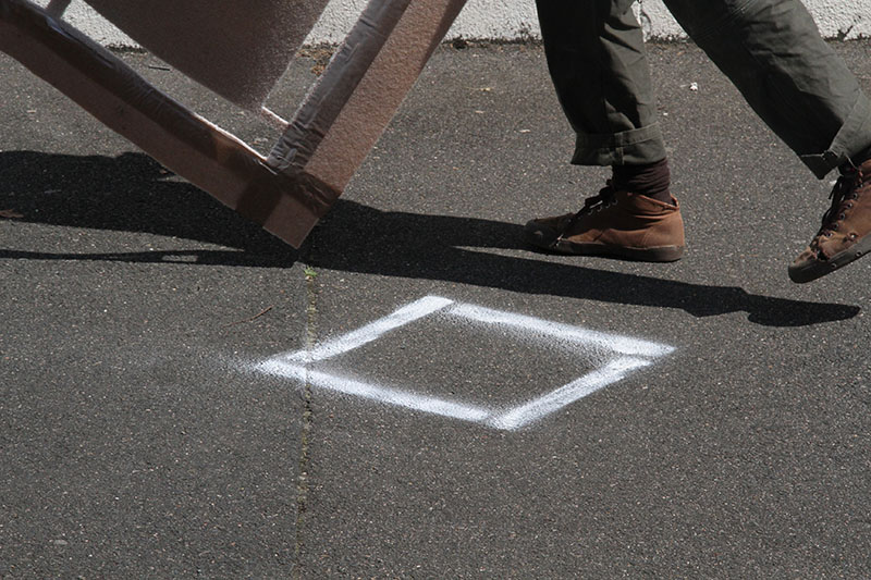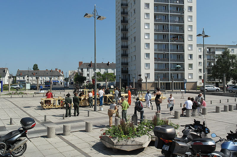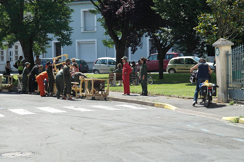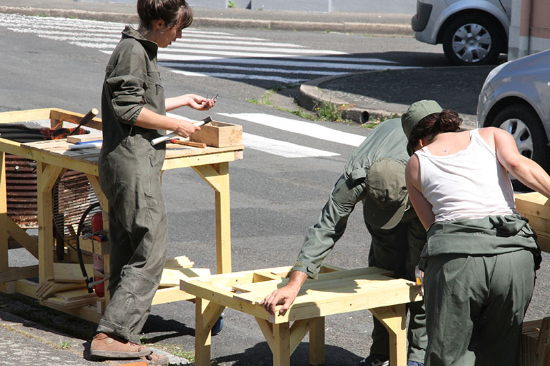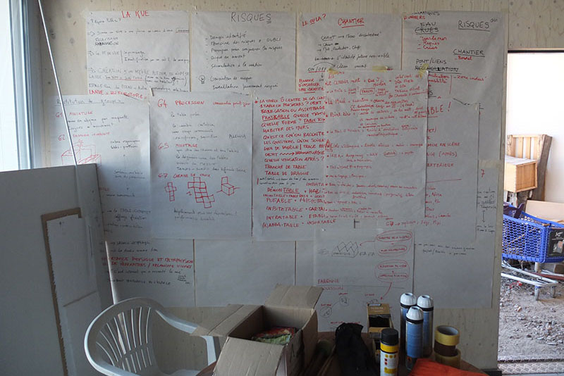On se remet autour de la table, il nous reste à trouver ce qu’on veut construire. Pour quoi ? Pour qui ? On soulève de nombreuses pistes et on discute encore beaucoup. Après un temps d’échange de références, on part sur l’idée de la construction d’un objet en série qu’on pourra essaimer dans différents lieux de la ville. L’idée étant de travailler d’un côté la fabrique mobile de cet objet et la chorégraphie de sa construction, de l’autre côté il s’agira de raconter l’histoire : trouver un itinéraire, un propos urbain et des sites de fabrication où l’on disposera les éléments construits, réalisant des micro-aménagements dans différents lieux de la ville.