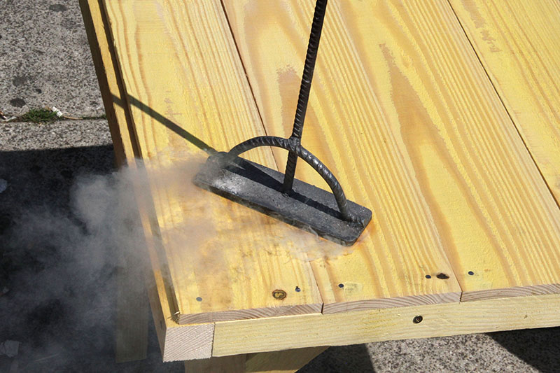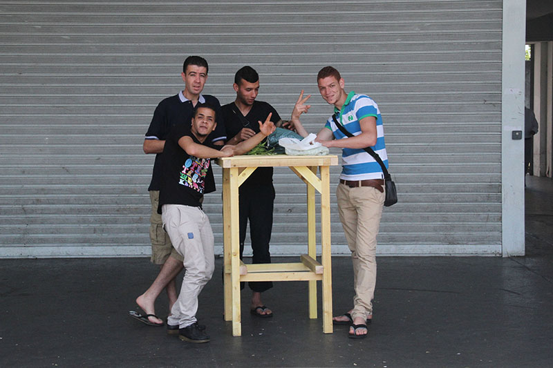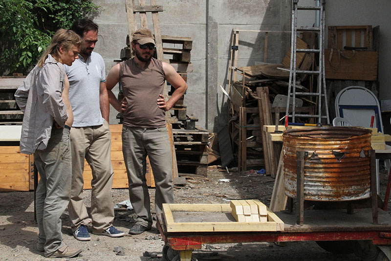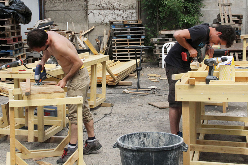 Après quelques esquisses, on fabriquera des tables de tailles différentes qui, assemblées pourront provoquer divers usages dans les lieux choisis. Une première équipe travaille à concevoir et réaliser les prototypes de tables, sur les questions de dessin, de mise en œuvre et de structure. Une fois l’objet mis au point, l’équipe a imaginé la mise en scène de sa mise en œuvre. Un atelier mobile de fabrication, fusion entre spectacle vivant et artisanat. On parle de Chaplin dans les temps modernes. La « grosse machine qui pond des tables » sera autonome en bois, en électricité et fera de la musique.