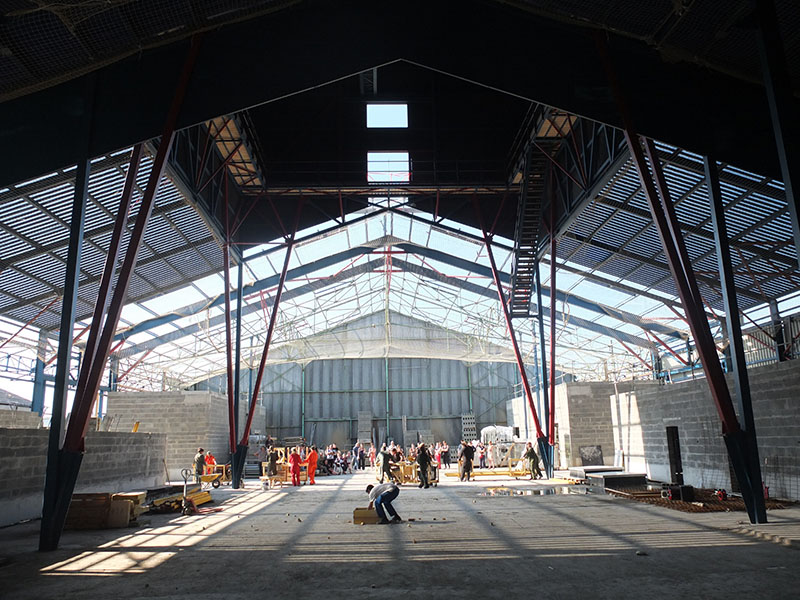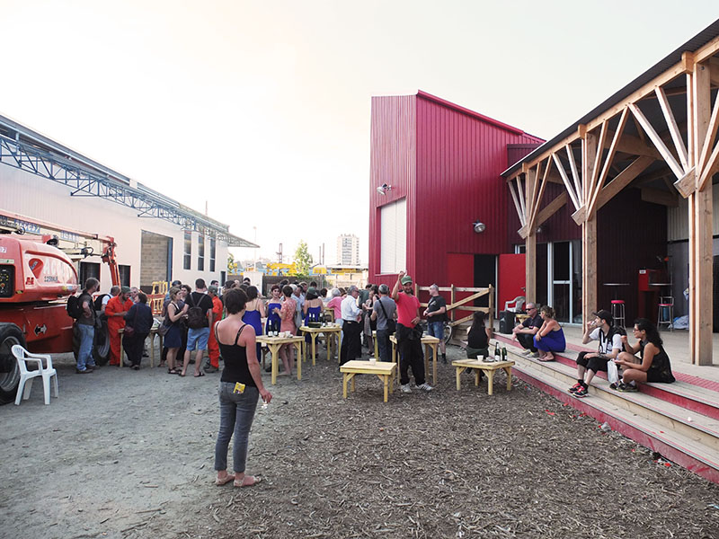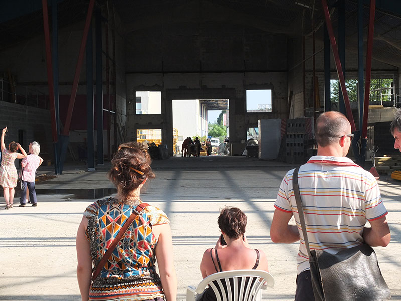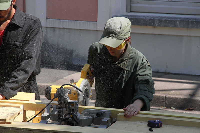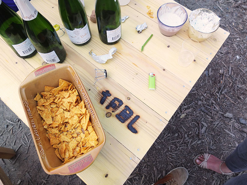 A 18h, nous avons invité du monde pour une restitution du travail. L’épopée se termine sur un format de représentation. L’équipe entre par la nouvelle porte d’entrée du bâtiment en chantier. Après une mise en place, la machine se remet en route pour produire les dernières tables, la construction des tables qu’on a essaimé toute la journée devient une chorégraphie le temps d’une représentation, curieuse dernière étape d’une journée peu ordinaire. Une fois la dernière table sur pied, la machine s’arrête pour de bon. On se retrouve dans la rue centrale pour raconter nos aventures et fêter la fin de cette expérience. Tout s’est déroulé comme prévu, tout le monde est bien fatigué, on est sur la route depuis 7 heures, la pression retombe.