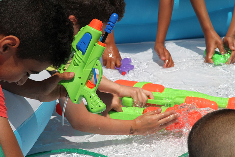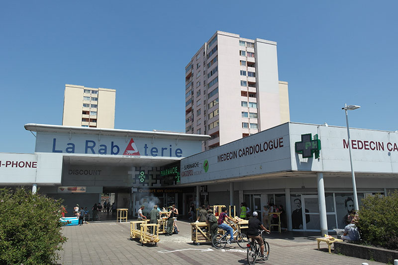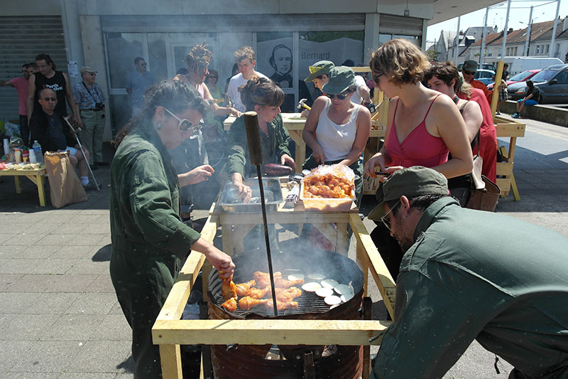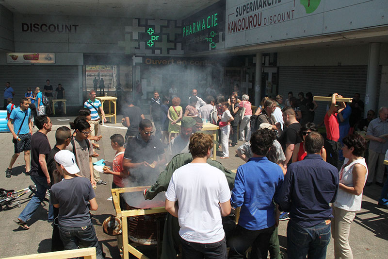 Pour la pause de midi, une étape plus conséquente nous attend. Une équipe s’est détachée pour préparer un grand pique-nique dans le quartier de la Rabaterie construit dans les années 70-80. De là-haut, on est pas menacé par les crues. Aujourd’hui le quartier est classé ZUS et la rénovation urbaine bat son plein. Nous avons fait des courses dans les différentes boutiques du centre, la forge mobile se transforme en barbecue, on fait cuire des centaines de saucisses et on partage un grand repas. On échange sur le quartier, sur notre intervention, sur les aménagements en cours. Le temps d’un repas, on occupe les espaces publics. Du haut du toit, Pierre nous raconte un autre morceau de son histoire du quartier. Tout se termine dans une bataille d’eau. Il est temps de repartir.