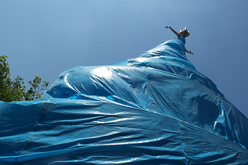 Jean Vindras est un artiste plasticien local. C’est lui qui a réalisé les sculptures de Don Quichotte et Sancho sur le parvis de la gare. Nous avons fait connaissance lors de nos premières explorations. Sa cour déborde de sculptures métalliques en tout genre. Au fond, une immense tour de Babel dépasse de plusieurs mètres. Une scène surréaliste nous attend là. Perché en haut de la tour, une étrange femme chante et tient des pauses dignes d’un opéra. Pierre délire, il mélange les histoires des tours de la Rabaterie et la folie des grandeurs de la tour de Babel, pour se tenir à l’abri d’un éventuel déluge, les hommes auraient entrepris de construire une tour qui atteindrait le ciel. Dieu les aurait arrêté en brouillant leurs langages, semant la zizanie dans le chantier. Étrange métaphore des grands ensembles dont nous sortons tout juste.