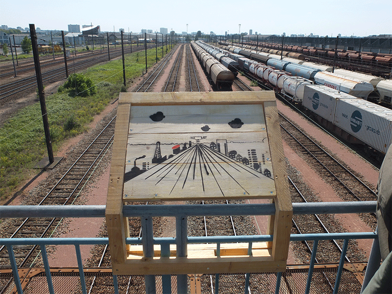 Nous faisons halte au beau milieu du pont qui traverse l’immense fleuve ferroviaire. Aujourd’hui la ville est coupée en deux, mais les voies ferrées ne sont plus autant utilisées. Les centres de maintenance ont été décentralisés, le Fret ne vit pas ses grandes heures, et si le fleuve venait à se tarir ? On pourrait imaginer une reconquête de ces territoires par la ville ? Pour l’occasion, on a construit une table d’orientation un peu spéciale qui illustre cette vision. Des complices sont prêts à agir dans différents coins du paysage et viennent animer des éléments du tableau réel avec des fumigènes, des explosions ou des vélos à fusées de détresse. Les regards cherchent leur cible dans une succession d’actions en chaînes qui reconnectent virtuellement les deux villes de Saint-Pierre-des-Corps.