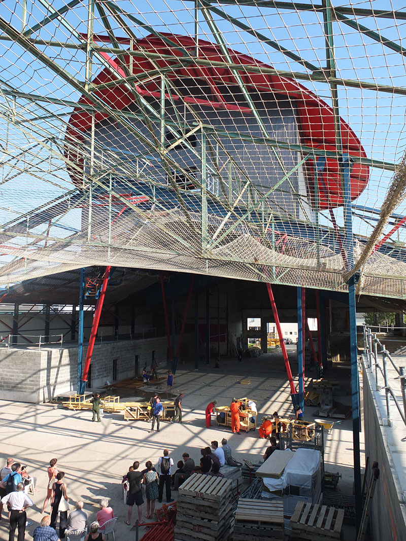 – Chloé Bodart, architecte mandataire de la transformation du lieu, en compagnie de Léo Hudson, résident sur place pour assurer la permanence architecturale, nous racontent le projet autour de la maquette et nous font visiter le chantier en cours. La notion de chantier ouvert prend sens ici par la présence des usagers du lieu qui s’emparent de cette notion avec beaucoup de talent.