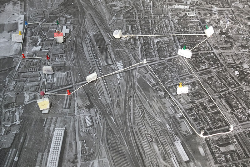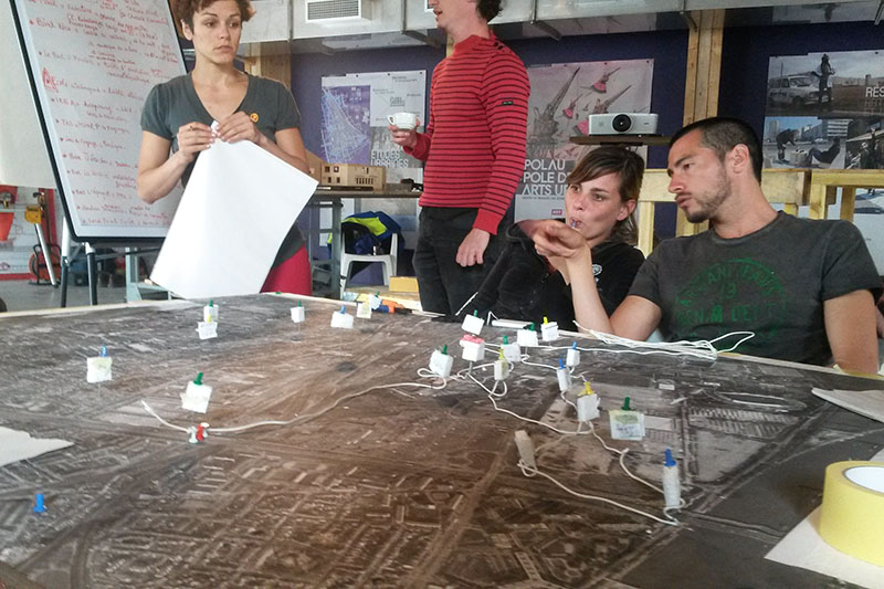 La deuxième équipe part en exploration dans la ville pour préparer les étapes de notre épopée. On rassemble toutes les informations collectées autour d’une grande carte. Certains lieux résonnent plus que d’autres, rapidement on fixe un itinéraire : un parcours à travers les différentes époques, abordant les différentes problématiques urbaines : La place du réseau ferré, l’histoire des cheminots, le rapport à l’eau, aux risques d’inondations, etc. En groupe de 2 à 3, on prépare les étapes, les contacts sur place, et un temps d’activation qui viendra marquer la pause et mettre en scène le nouvel aménagement. Tout le monde a du pain sur la planche, le groupe se met en ébullition.