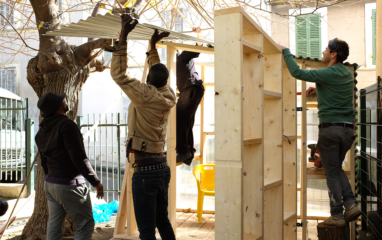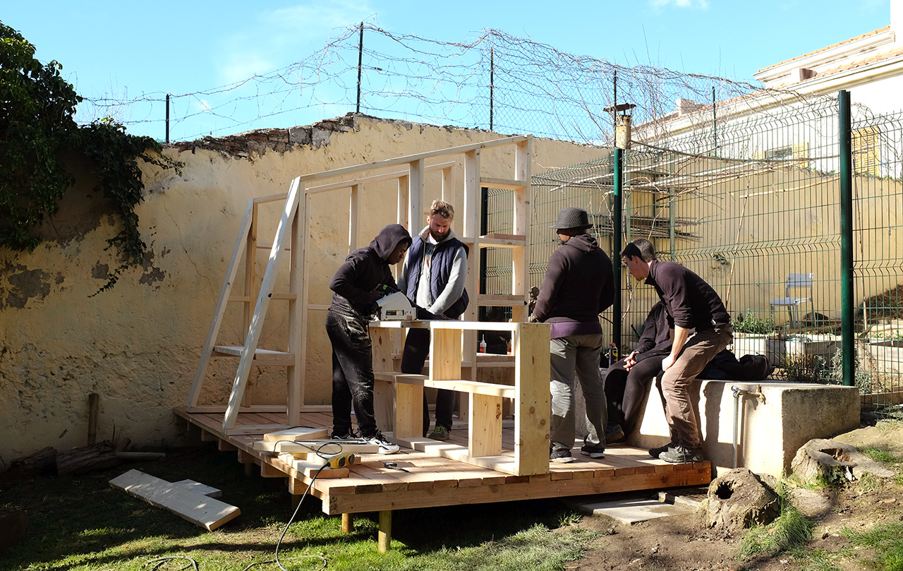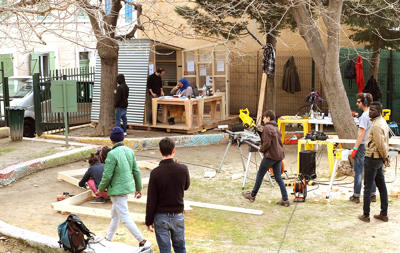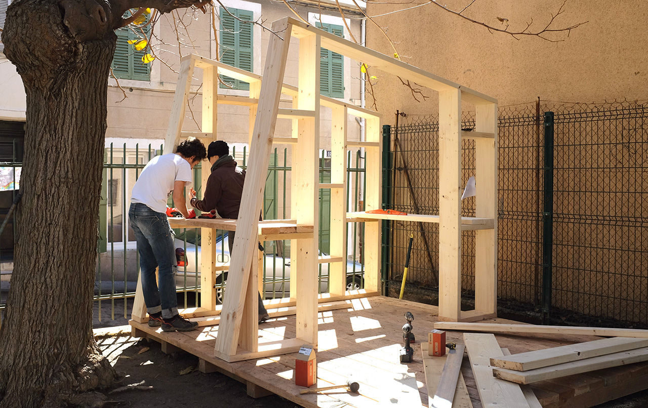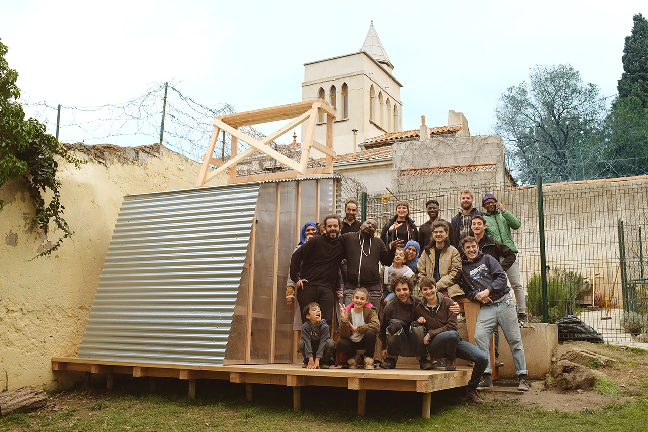 Peu de temps après notre installation dans nos locaux de l’Ambassade du Turfu dans le 3ème arrondissement de Marseille, nous avons rencontré l’association Les amis du jardin Spinelly, un groupe d’habitants mobilisé sur l’animation d’un jardin public situé sur la butte Saint-Mauront. Ils ont sollicité notre aide pour construire une cabane à outils et un kiosque d’accueil, afin de consolider leurs activités sur le lieu. Nous avons mené un chantier sur place au début du mois de mars 2018, en compagnie des voisins et de plusieurs bénévoles.