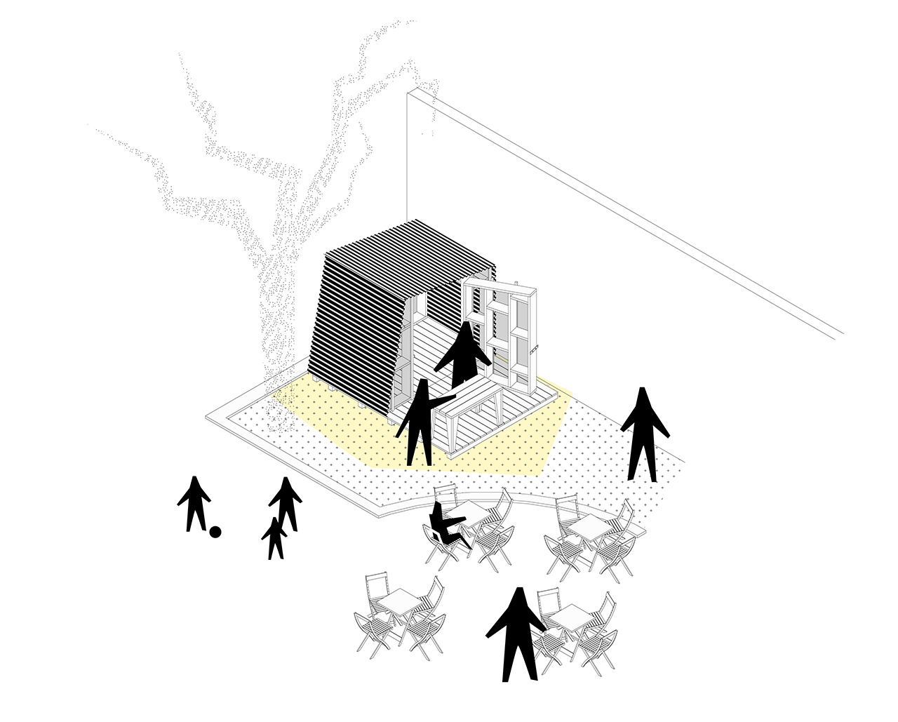 L’association souhaitait également disposer d’un espace pour entreposer du matériel de cuisine, servir des repas et des boissons pendant les évènements organisés au jardin, par exemple lors de l’incontournable carnaval annuel. Positionnée à l’entrée du parc, cette cabane devait aussi assurer l’accueil des visiteurs pour les informer du fonctionnement du jardin et des activités programmées.