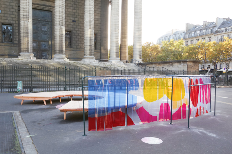 En complément, nous avons souhaité préfigurer de nouveaux dispositifs spatiaux mettant en scène le son et la lumière. Pour cela, nous avons mis en place des éléments connectés aux assises : des vitraux urbains. Ces formes abstraites isolent du bruit et invitent habitantEs et passantEs à faire une pause.