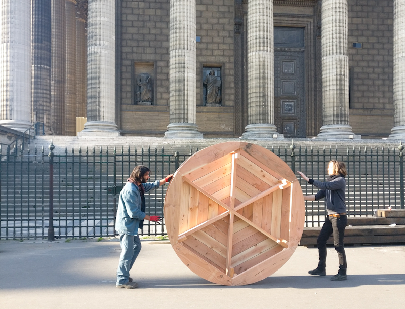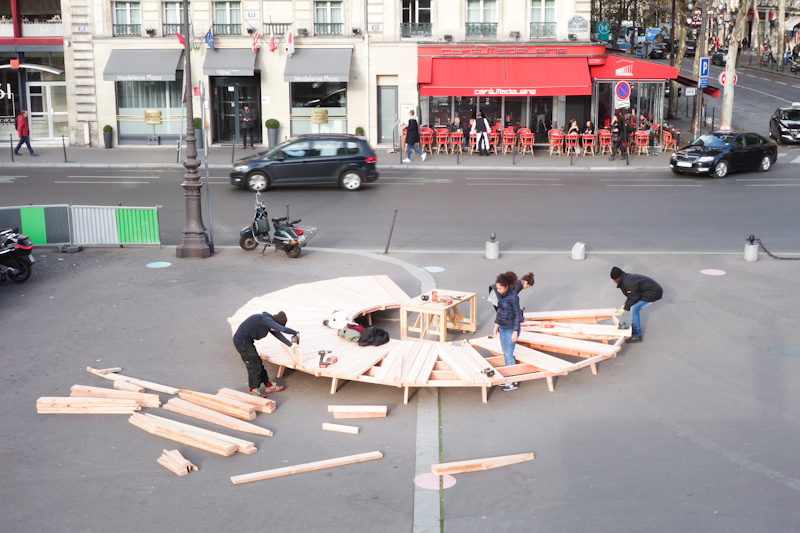 La ville de Paris a acté en 2015 de rendre piétonnes les contre-allées longeant l’église, réservées autrefois au stationnement automobile. Elle nous a ensuite missionné pour occuper temporairement les lieux afin de questionner le type d’espace public qui pourrait y naître, et à quels types d’usages il pourrait être dédié. Cette démarche expérimentale répond à la volonté d’introduire plus de flexibilité et de résilience dans les projets urbains.