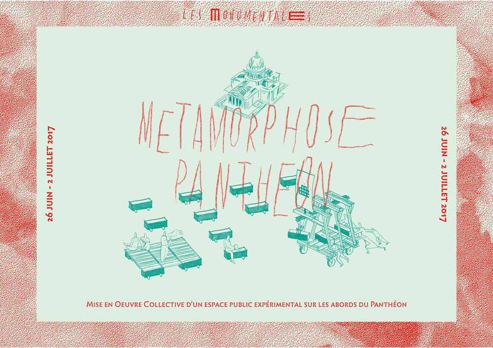 Nous avons construit avec les Monumentales une démarche de projet nous permettant divers tests et prototypages d’usages et d’espaces dans un temps relativement long. Tout d’abord nous faisons suite à une pré-étude de définition qui a déjà eu lieu sur la Place du Panthéon.
