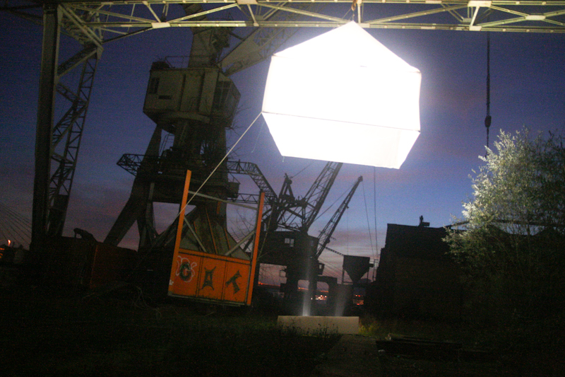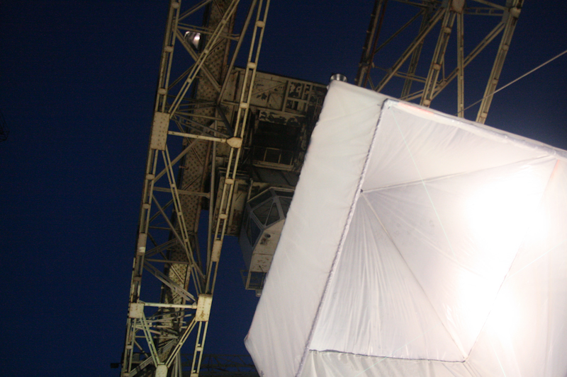 C’est cet équilibre à trouver que nous avons voulu mettre en évidence, en suspendant sur le pont de levage une maison à quatre pans symbolique.