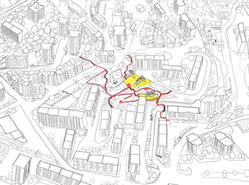 Pour les participant·e·s des ateliers, le cheminement devait permettre une diversité de pratiques : se déplacer rapidement, se promener, mais aussi faire du sport, flâner, se poser avec ses voisins·e·s… Ces demandes ont amené l’idée d’un « parc-chemin », composé d’un double cheminement avec un axe court, plutôt sportif, combiné à un axe doux qui serpente le quartier en pente progressive. Et, aux intersections de l’axe court et de l’axe doux, trois haltes, sur lesquelles seraient installées les œuvres praticables.