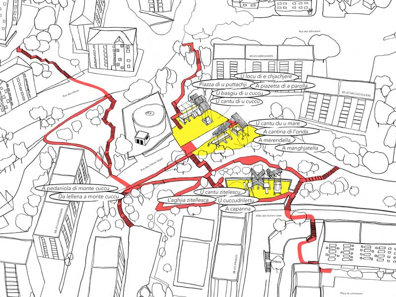 Initié par la Ville de Bastia, ce projet consiste à la création d’un cheminement piétonnier au cœur de Lupino, quartier échelonné dans les pentes du maquis corse. La commande repose sur la rénovation d’un tracé existant très dégradé – composé d’escaliers et de sentiers sauvages – et sur la création de nouvelles voies. À la construction de ce lien physique, l’appel d’offre intègre un volet « artistique » visant à l’installation d’œuvres d’art pour favoriser le lien social dans le quartier.