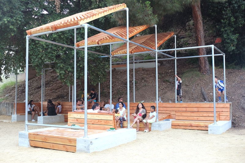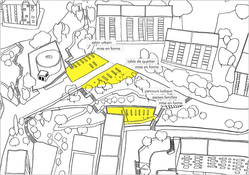 En superposant des structures temporaires sur une base d’aménagements pérennes, nous cherchons à permettre une réversibilité des formes dans le temps. Les œuvres pourront être consolidées et évoluer sur place. Mais si la ville décide de les démonter, les plateformes perdureront en tant que placettes et les plots béton pourront devenir de simples assises ou être réemployés ailleurs.