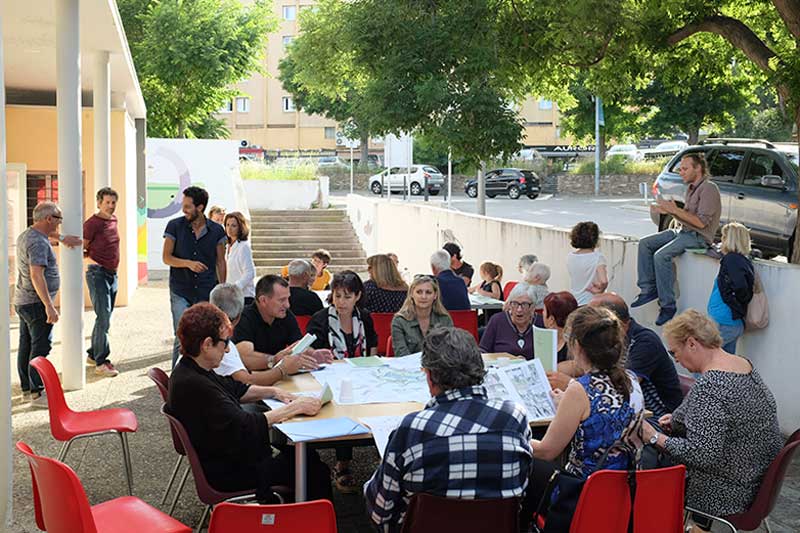 Cette journée a aussi été l’occasion d’ouvrir des pistes de réflexions pour nommer les trois nouvelles haltes. Autour d’une carte du quartier, nous avons animé un atelier de toponymie, qui a permis de faire ressortir plusieurs propositions mettant à l’honneur la langue corse et les noms du paysage local !