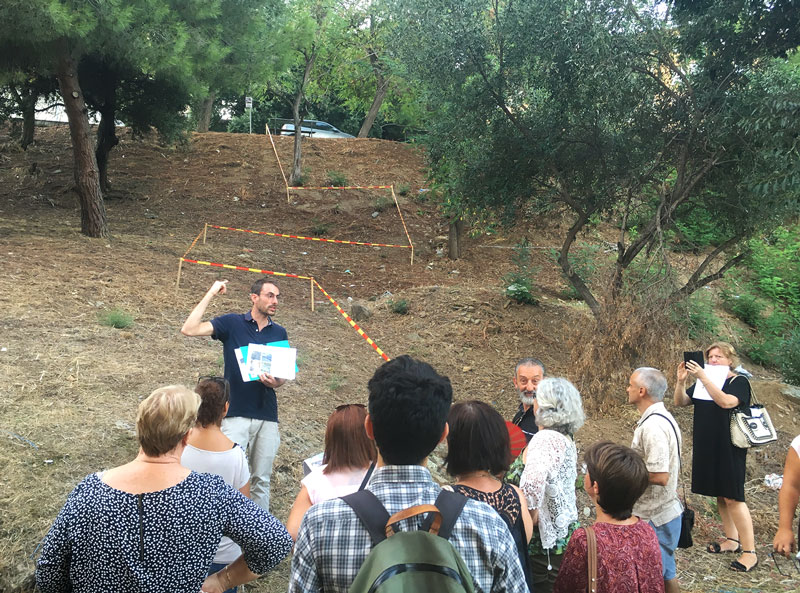 En septembre 2018, nous sommes retournés sur place pour présenter l’esquisse du projet sous la forme d’une balade commentée. Nous avons réalisé un tracé in situ, pour discuter des emplacements des chemins et des œuvres praticables.
