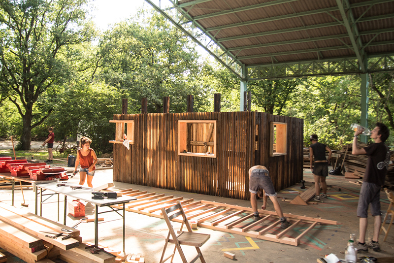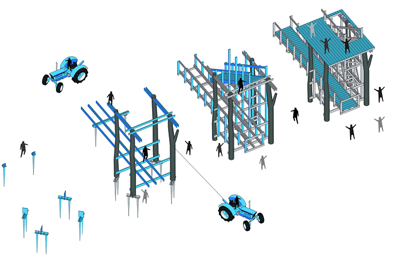 Deux chantiers ont eu lieu en parallèle : d’un côté, une équipe implantait et érigeait la structure porteuse ; de l’autre, sous la nef, sur le plancher de trace, une autre préfabriquait au sol la maisonnette destinée à y être perchée.