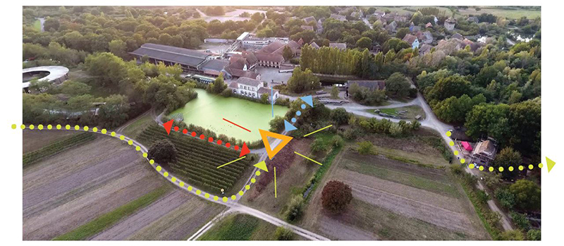 Le parcours agricole commence à la grange-étable de Sundhoffen : il traverse les époques et les cultures pour reboucler à proximité de la « gare » et du plan d’eau, où nous avions installé un bac en 2015. En léger surplomb, avec une vue potentielle sur l’ensemble de l’itinéraire parcouru. Le but est d’y offrir une « lecture synthétique du Théâtre d’Agriculture ». Le belvédère devient par la même occasion un signal visible de loin qui articule le parcours, soit vers un rebouclage / sortie, soit vers le site du Bauistella. Il fait donc l’articulation entre le traditionnel et la recherche, la réinterprétation, la réappropriation de l’essence du vernaculaire réinjectée dans le monde actuel, voire projetée dans le futur.