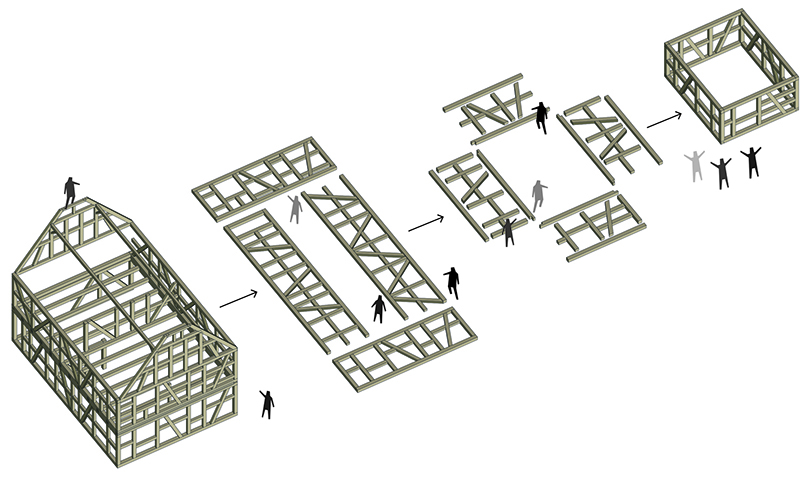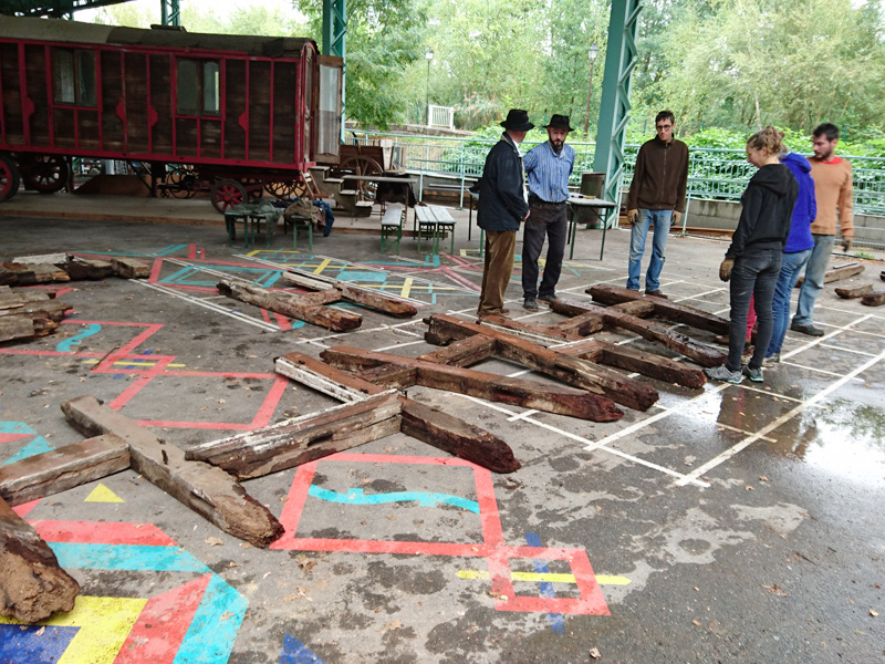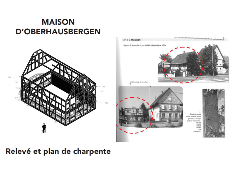 Quand l’Écomusée nous invite à remonter un colombage en 2016, c’est déjà dans l’idée de nous confier un nouveau chantier. L’occasion de nous former, tout en appréhendant le matériaux et se projetant. Un premier temps qui nous permet aussi d’inventorier, car le bois qui nous est destiné est déjà dans les réserves du musée. Un don de la ville d’Oberhausbergen : une ancienne maison de journalier démontée depuis 2006. Celle ci n’a que peu d’intérêt vis à vis du panel déjà exposé à l’écomusée, et son état ne permettait pas de la remonter telle quelle. La question qui nous est proposée alors est de ré-employer cette matière « avec notre écriture », et donc d’y apporter une touche « contemporaine ». Ce qui nécessite de savoir de quoi on dispose.