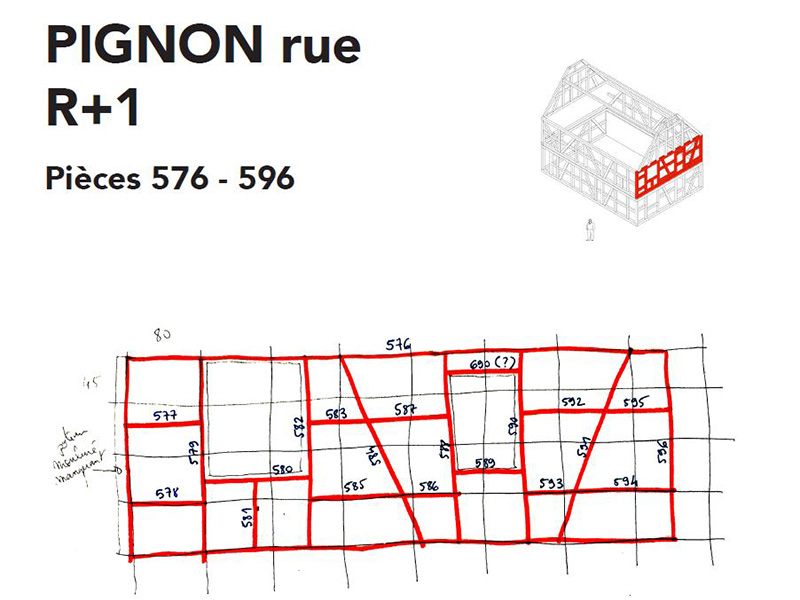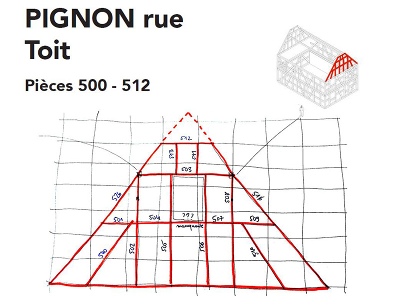 Nous n’avons de trace qu’une photo de mauvaise qualité. Pas de plan de démontage non plus mais chaque pièce a été préalablement numérotée, nous permettant aisément de reconstituer des pans de murs. Avec quelques éclairages de Guy, nous comprenons mieux les logiques. Un vrai puzzle grandeur nature, mais surtout un travail de relevé, de nettoyage et de diagnostic des bois.