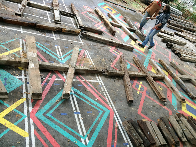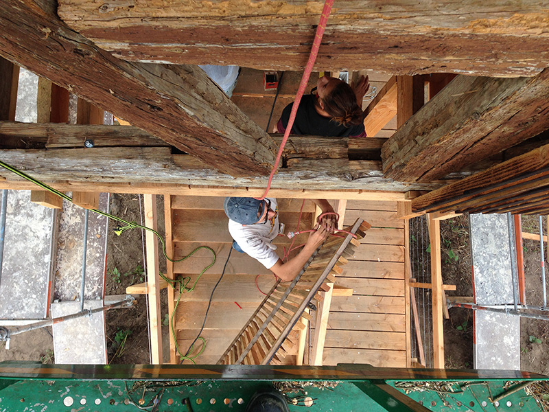 Un autre avantage majeur de la construction à pan de bois, que l’on a bien pu mettre à l’épreuve, est son aspect démontable, thème du Bauistella de cette année. D’autant plus intéressant lorsqu’il s’agit de construire en hauteur. Comme cela peut se faire pour des refuges de montagne, et comme cela se fait par pan pour les colombages alsaciens, nous avons fait un montage intégral à blanc, au sol, de la cabane destinée à être remontée en haut de la structure.