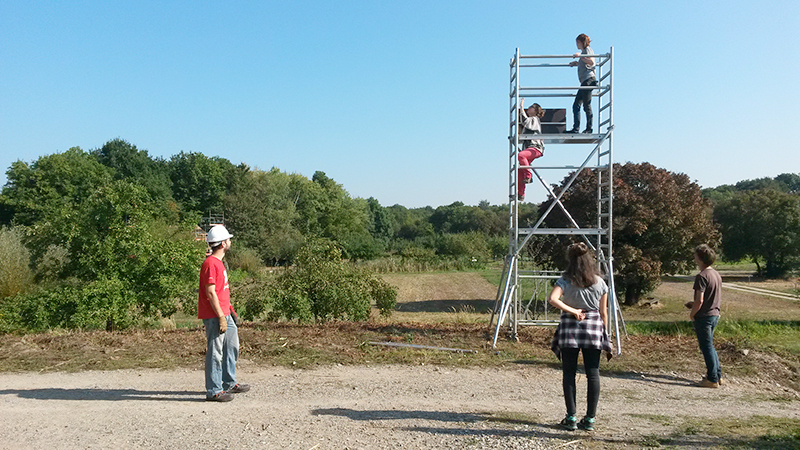 Entre deux levées de poutre du chantier de Sundhoffen, nous avons emprunté la tour d’échafaudage pour tester in situ l’implantation du belvédère, de vérifier sa visibilité et ses vues potentielles.